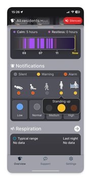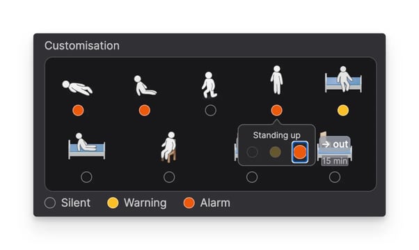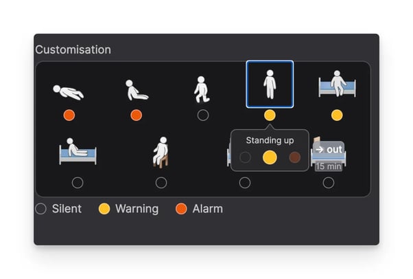 - Press normal and you’ll receive fall alarms, and warnings for ‘standing’ and ‘sitting on edge of bed’ (these are the default settings).