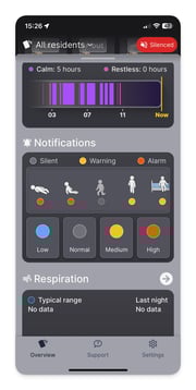 - A blue circle indicates 🔵low risk where you will be receiving nearly no notifications on this resident. Often only fall alarms.