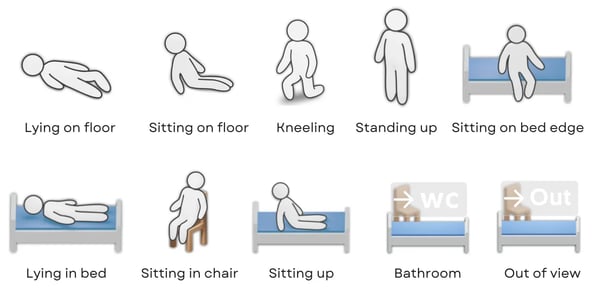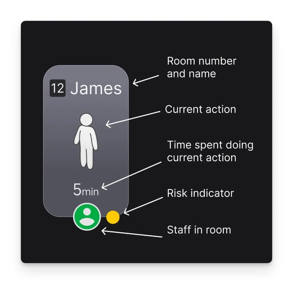 What we at Teton call a 'resident card' is an individual card for each resident in a department, and when looking at the overview you can see all the person cards simultaneously. With the resident card you have the opportunity to see the residents' current activity, how long the activity has been ongoing, what risk indicator the person has, and if there are other people besides the resident inside the room.