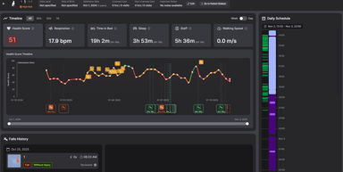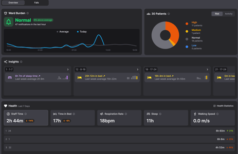 - Trends in resident health (such as time spent with staff, time in bed, respiration, sleep and walking speed), with information about highly ranked residents