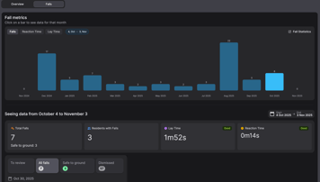 - Switch to the ‘Falls’ category at the top of the page (next to the ‘Overview’ category). Here you can see even more details, such as number of falls per month, response time, time spent on the floor, etc.
