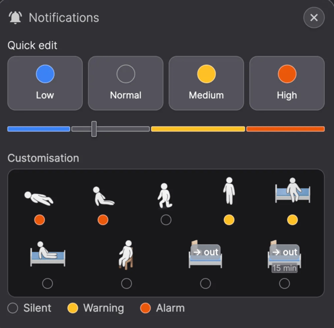 💡All new residents will be set with 'Normal' notifications set, meaning there will be Warnings for sitting up in bed and standing, and alarms for sitting or laying on the floor.