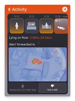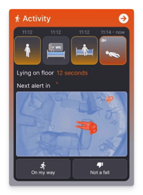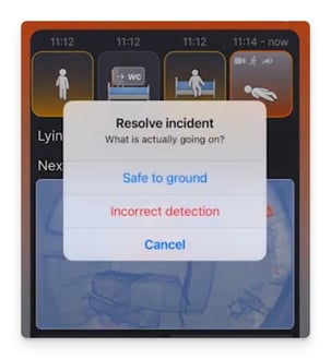- Incorrect action - this indicates that the system was incorrect in saying that a resident was on the ground. The red colour will be removed from the card, and a thumbs down will be added to the card to show it as ‘incorrect’.